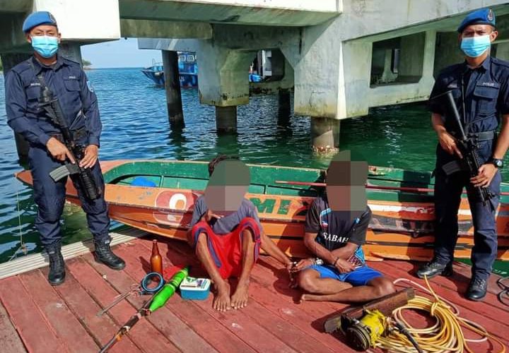 LAHAD DATU - Pasukan Polis Marin (PPM) merampas pelbagai alat mengebom ikan termasuk sebuah perahu enjin pam dari dua lelaki ...